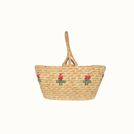Vintage Coil Basket with Red Flowers and Triangle Handles