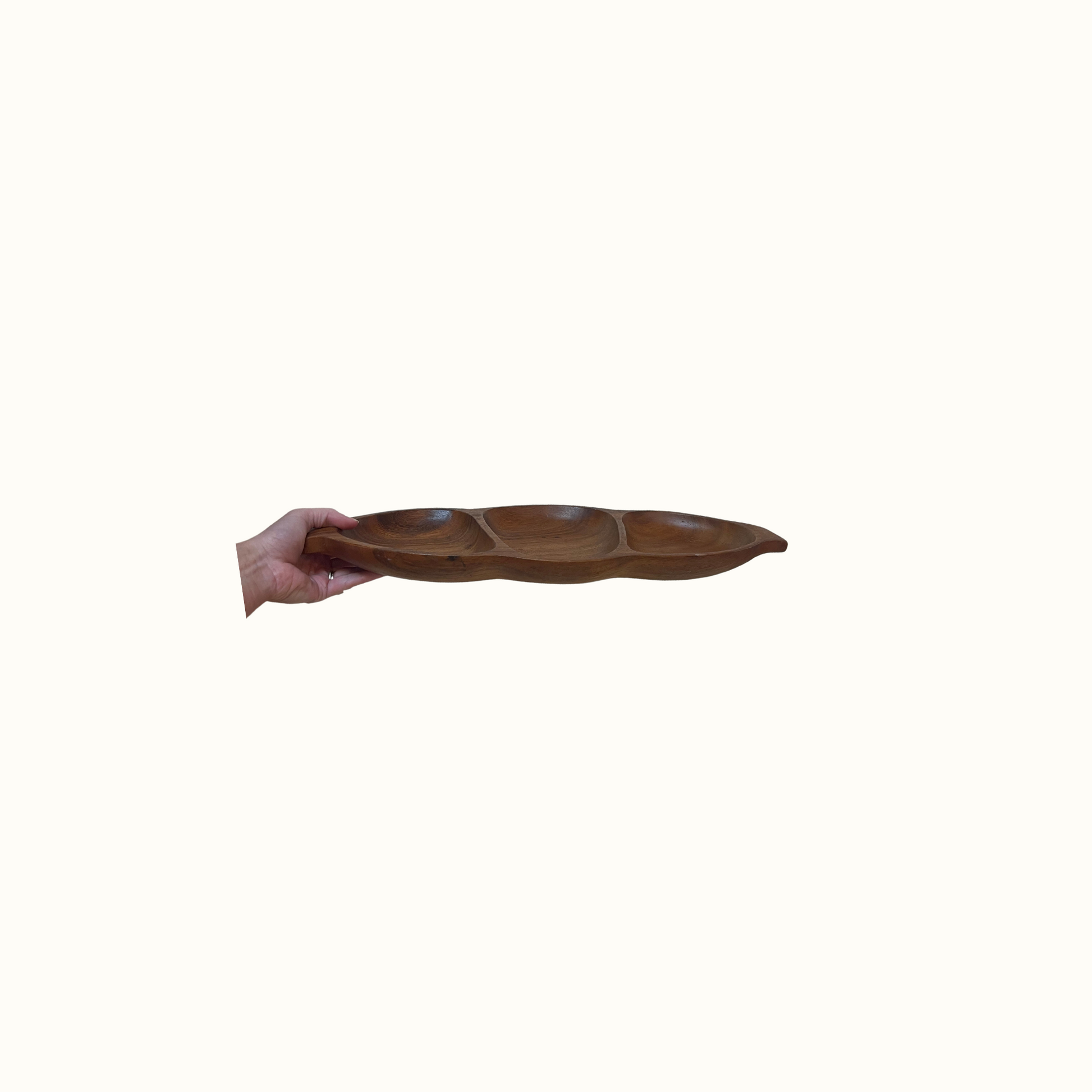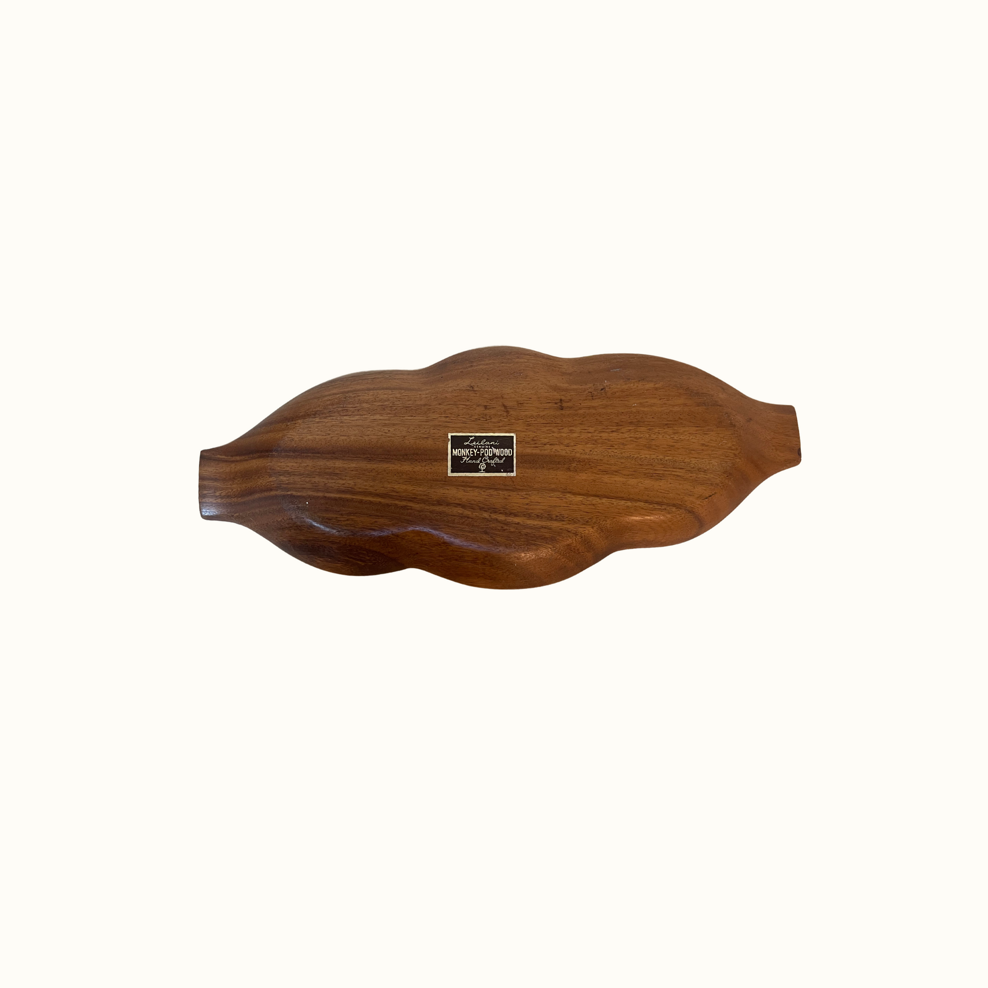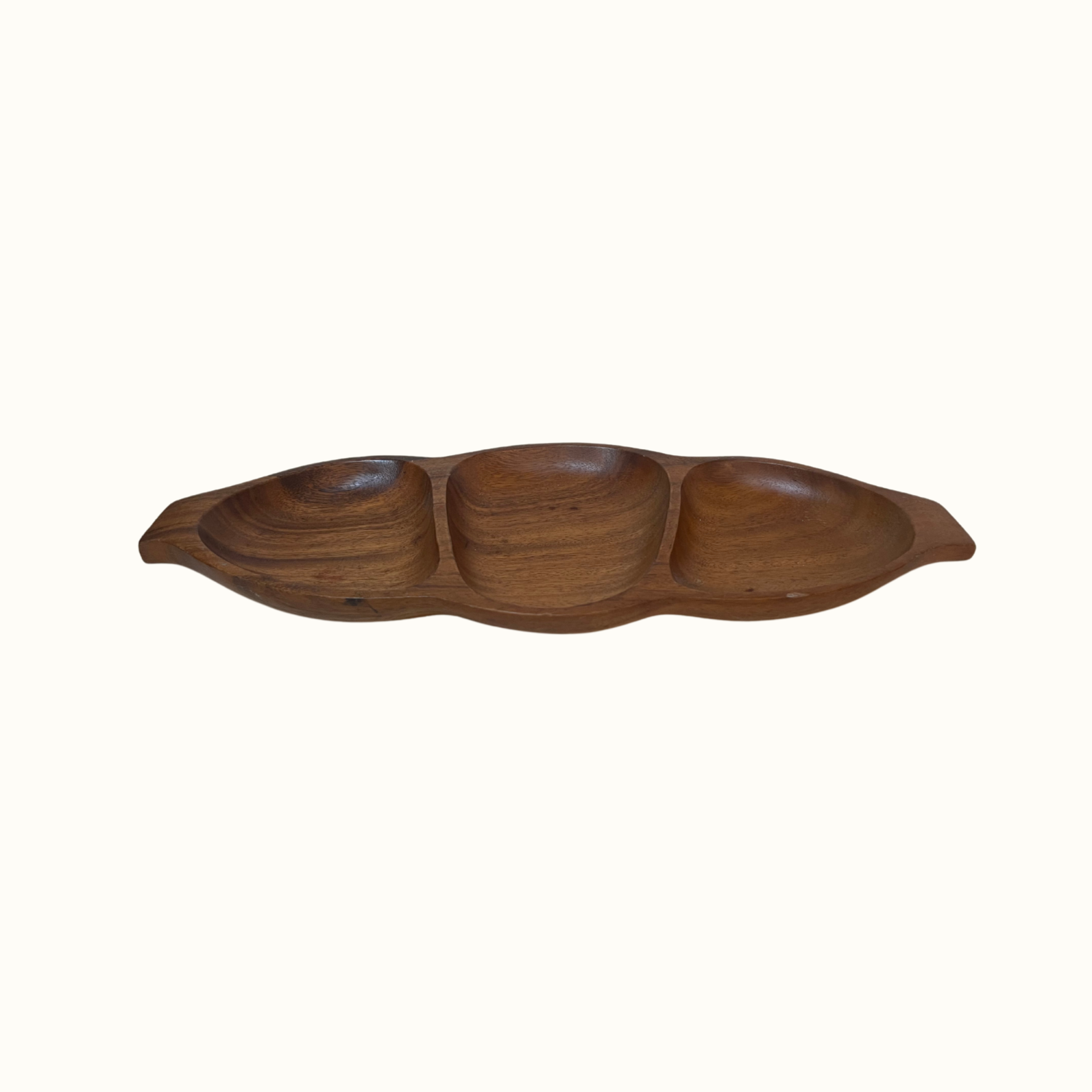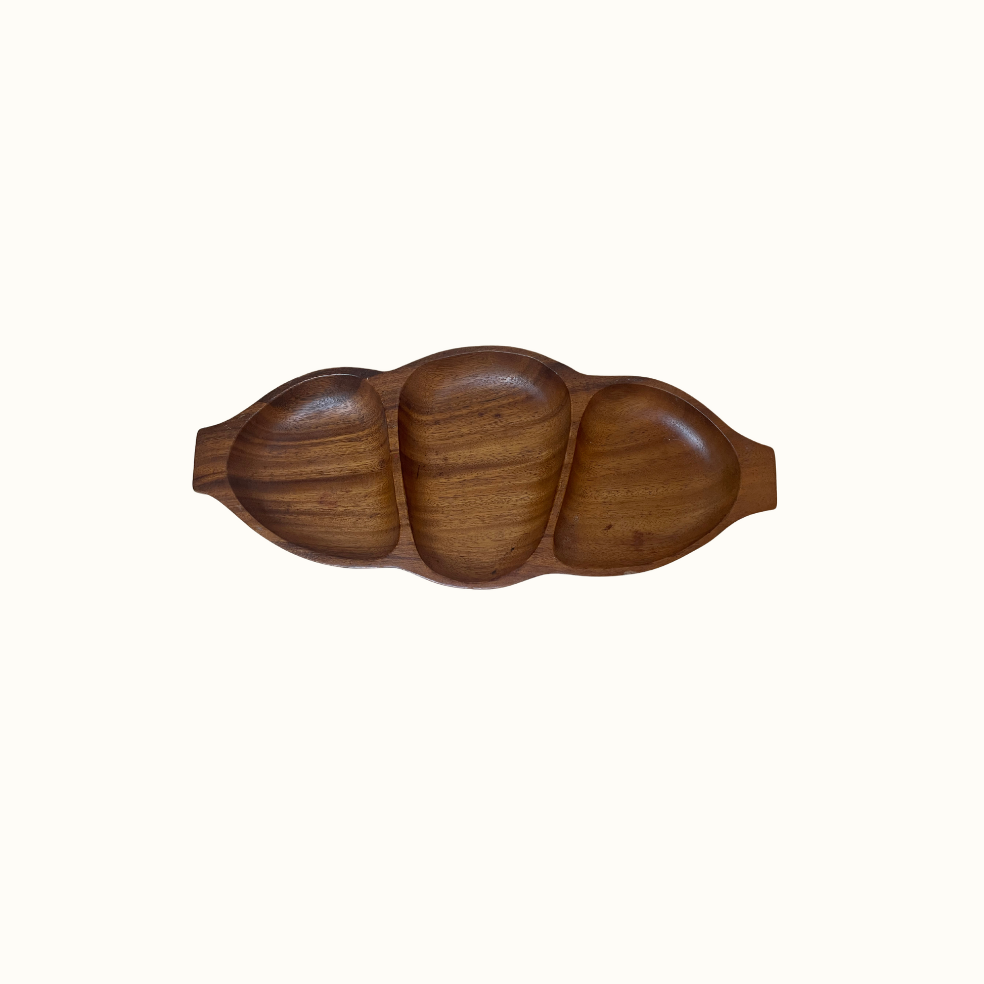 Beautiful vintage wooden 3 section pod bowl, serving tray. Sticker on bottom reads "Leilani Genuine MONKEY-POD WOOD, Hand Crafted".